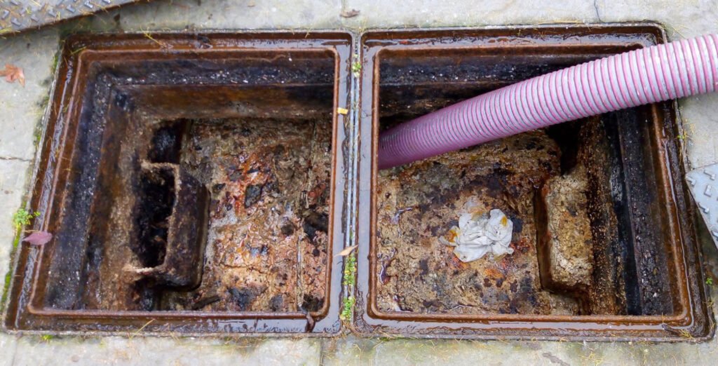Vidange des bacs à graisse, généralement présents dans les cuisines professionnelles, pour éliminer les graisses accumulées et éviter les bouchons ou les débordements.